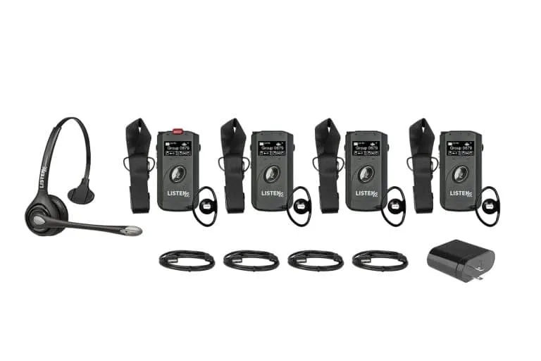 An ideal starter system for incorporating two-way communications, the LKS-1 ListenTALK System from Listen Technologies comes with everything you need. Each system includes four (4) ListenTALK Transceivers (with Leader Clips), one (1) Headset-2, and one (1) 4-Port USB Charger, all designed to enable convenient communication between one leader and up to three additional team members at a time. The LKS-1 is expandable to meet the growing needs of your venue, and more transceivers can be added at any time.